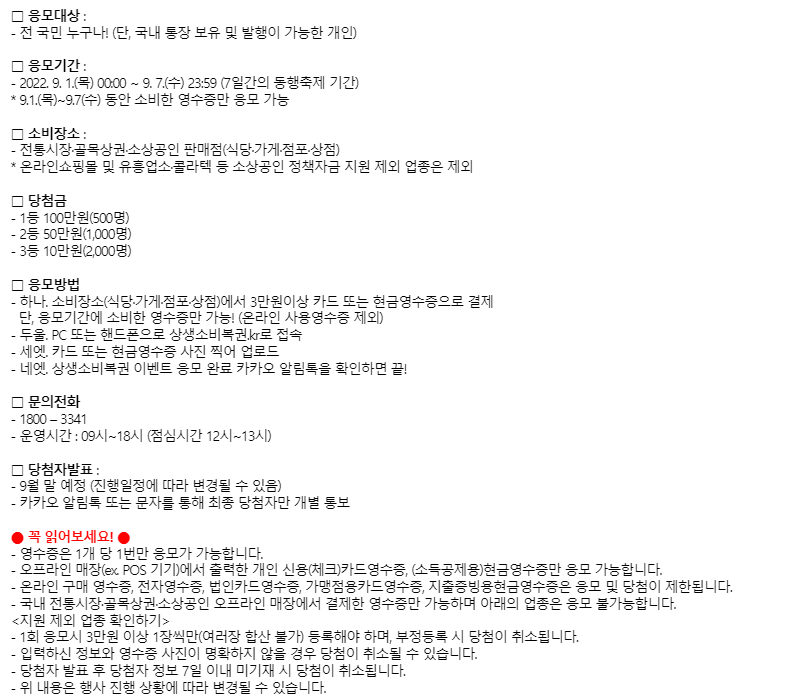 - 온라인 신청 및 당첨금액은 영수증에 따라 제한될 수 있으니 가급적 오프라인 구매를 권장합니다.