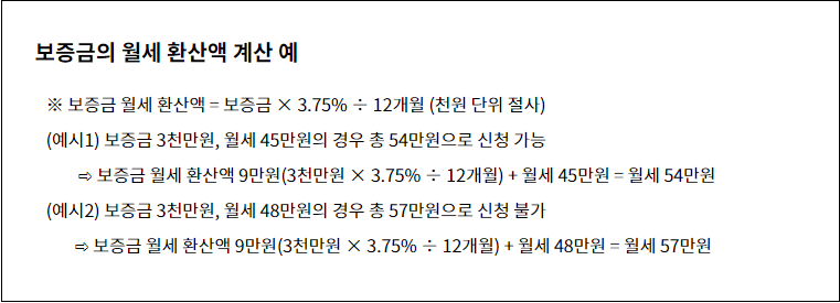 다만, 보증금 확보의 어려움으로 월세를 낮추기보다 높은 월세를 내야 하는 청년들을 지원하기 위해 월세가 40만원을 초과하더라도 보증금의 월세를 보증금으로 환산하면 금액(주택임대차보호법 상 환율 3.75% 적용) 월세 55만원 이하인 경우에는 신청할 수 있습니다.