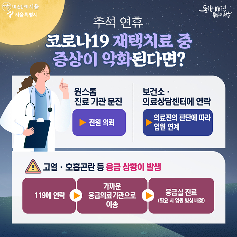 추석 연휴 기간에는 신종관상폐렴 진단을 받은 환자들이 집에서 진료 및 지도를 받을 수 있는 의료상담센터와 행정안내소가 차질 없이 운영된다. 증상 상담이 가능한 의료상담센터는 질병관리본부 홈페이지, 건강보험심사평가원 홈페이지, 서울 코로나19 홈페이지에서 확인할 수 있다.