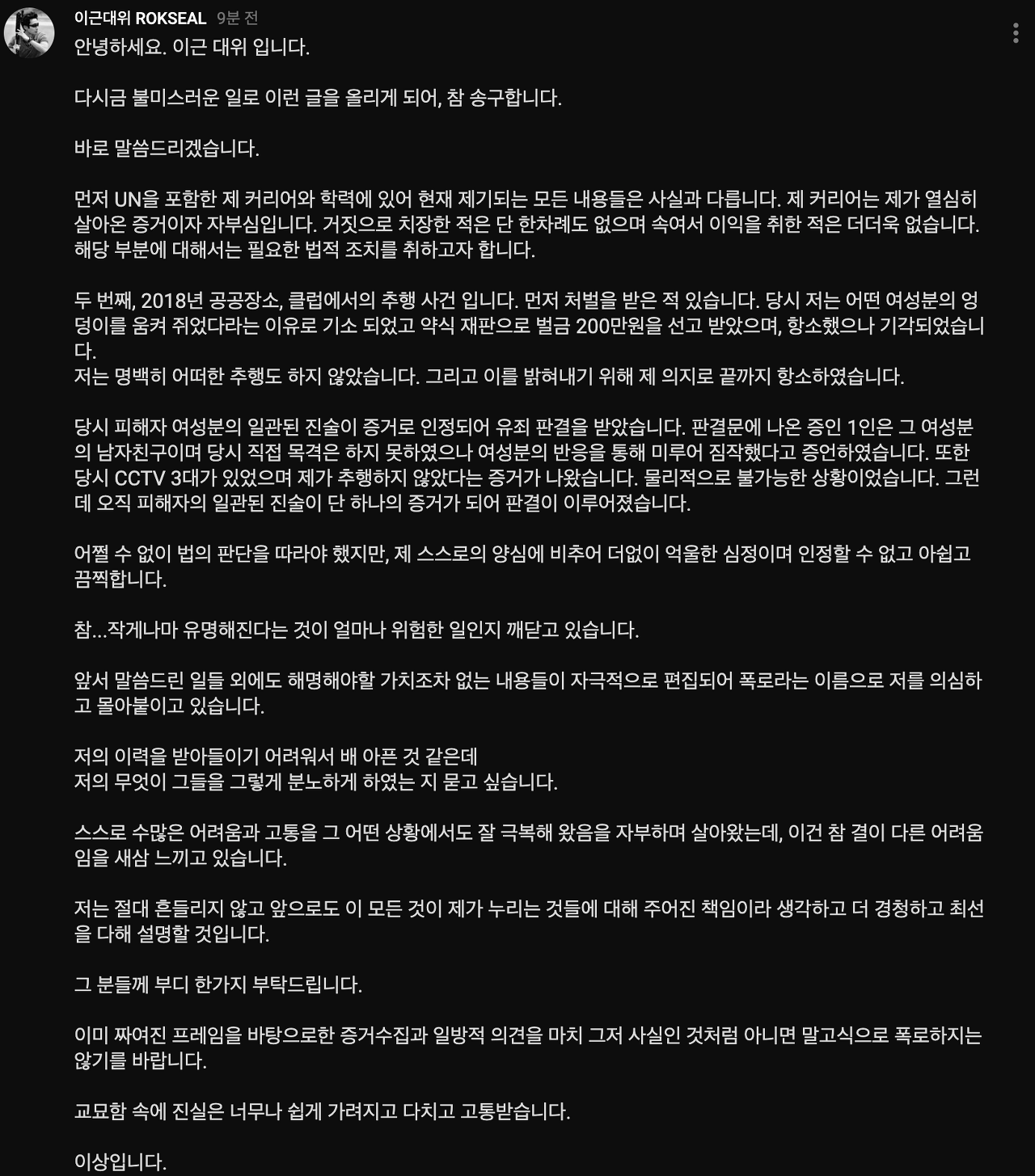 이근 대위 (+ 해명글 전문) '성추행 사건 유죄판결 사실, 하지만 피해자의 일관된 진술' 본문
