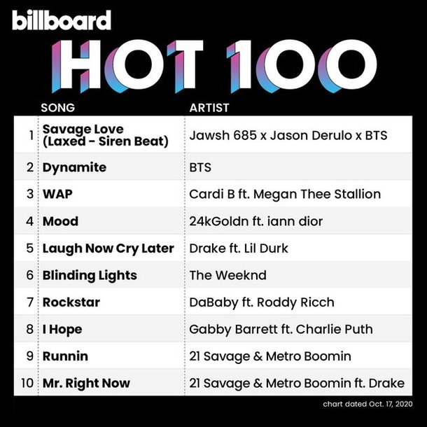 하지만, 앞선 Savage Love 원곡은 핫 100 정상에 오르지 못했는데요. 방탄소년단의 힘이라고 봐야겠죠. 뿐만 아니라 리믹스 버전은 빌보드 말고도 전 세계 66지역 아이튠즈 '탑 송' 차트 1위, 세계 최대 음악 스트리밍 업체 스포티파이 '글로벌 50' 차트 37위를 차지하는 등 세계무대에서 놀라운 성과를 이뤄내고 있습니다.