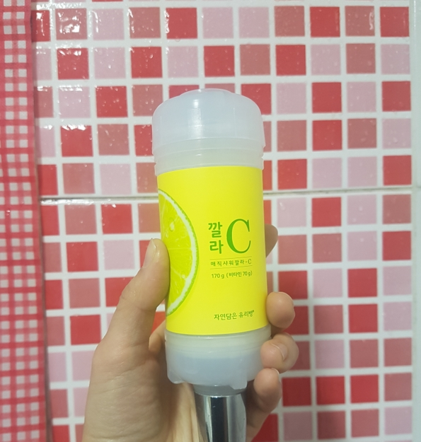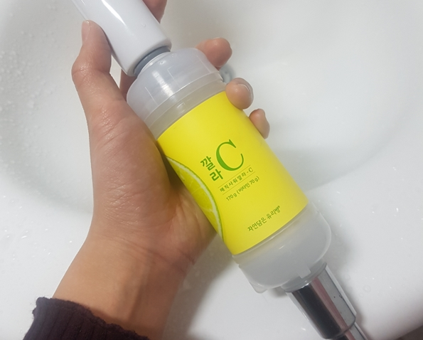 생긴 거는 요렇게 작고 귀엽게 생겼어요! 작은 원통형의 사이즈로 샤워기에 돌려 끼우면 끝이에요 기간이 오래가기 위해서인지 크기가 큰 것도 몇몇 봤는데 너무 크고 길면 무거워서 힘들 듯.. 이 정도 길이랑 무게가 딱 적당해요.