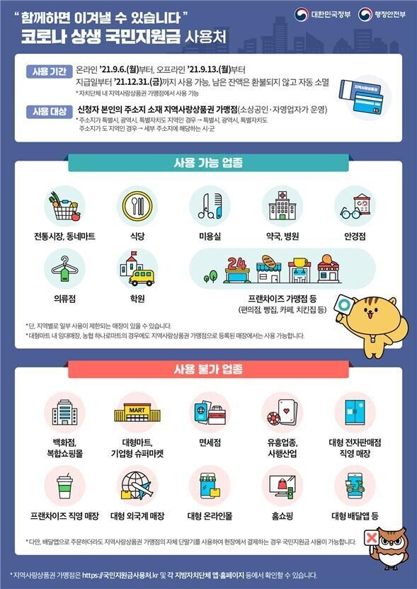 구체적인 국민 지원금 사용처는 지역사랑 상품권 앱, 자치단체 홈페이지 또는 국민 지원금 사용처 홈페이지에서 확인할 수 있습니다.