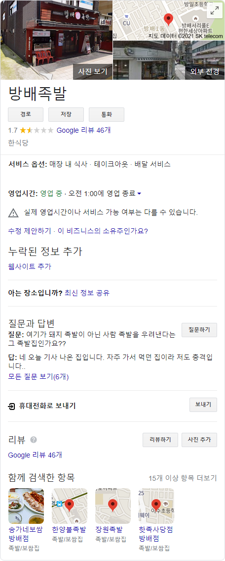 어떻게 찾았냐 하면, 바로 옆에 노란색 승합차가 보입니다. 방배동 구글 지도로 길 찾기를 해서 족발집 바로 옆에 있는 노란 승합차를 발견, 특정했습니다. 식약처에 적발된 방배족발은 이곳 방배동 먹자골목에서도 유명한 족발 맛집으로 잘 알려져 있습니다.
