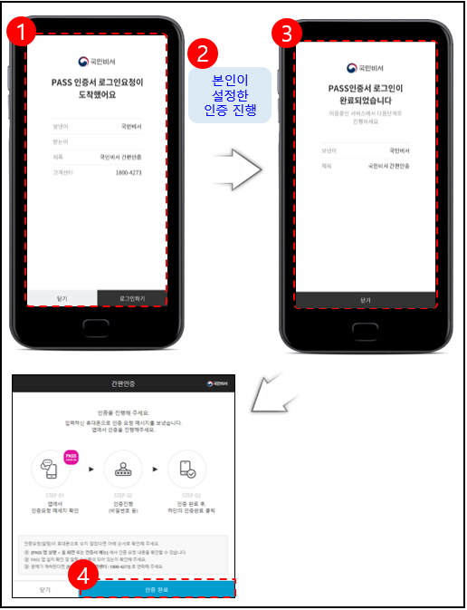 - 04 진행하던 간편인증 화면에서 [인증완료] 버튼을 선택하여 인증을 완료합니다.
