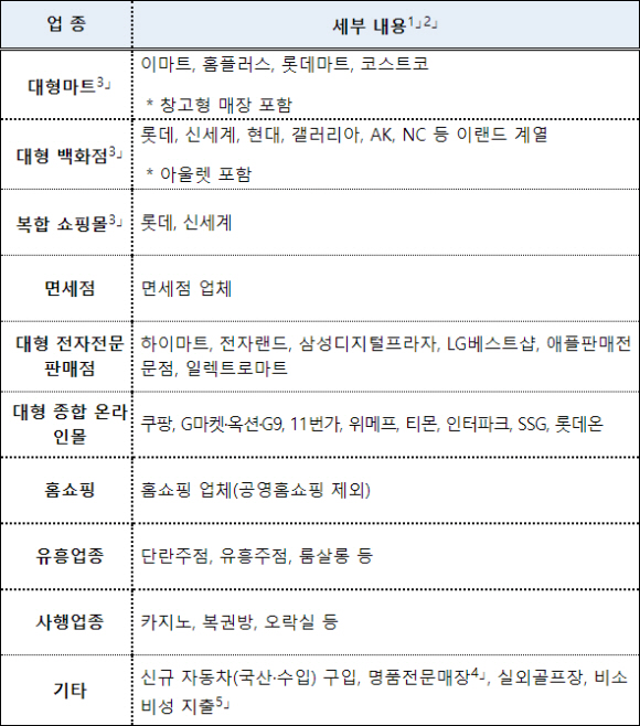 또 명품 전문점, 면세점, 홈쇼핑, 유흥업소, 유흥업소, 도박업(카지노, 복권방, 오락실), 신차 구입(수입 및 내수) 등에