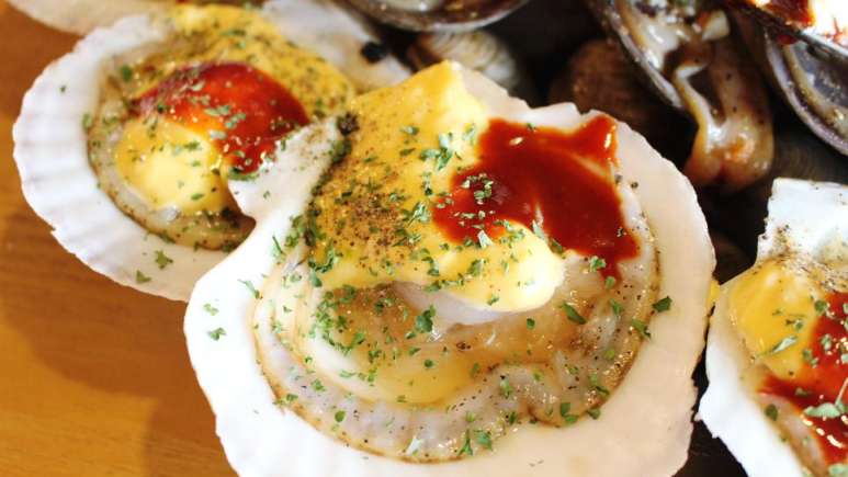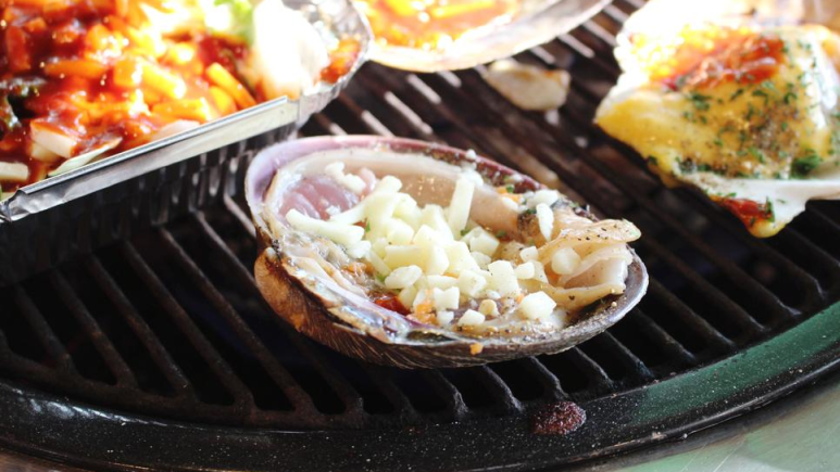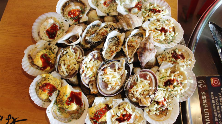 치즈 사리 살짝 올라가 있는 맛있는 치즈 조개구이 육즙이 나오고 치즈가 녹으면서 진짜 엄청 고소하고 맛있는 냄새가 올라오는데 식욕을 엄청 자극해요.
