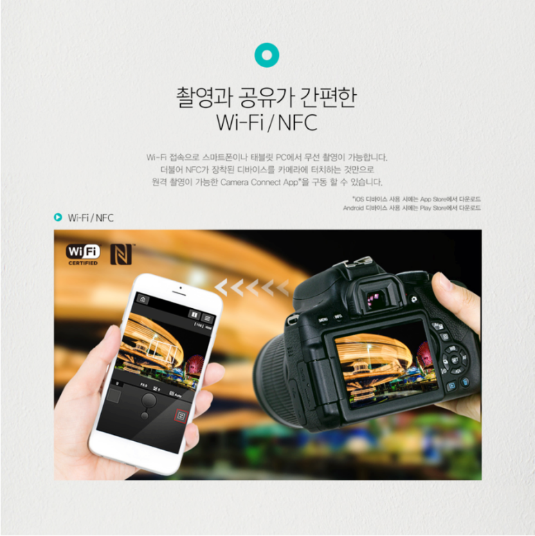 캐논 750D의 특징 중 하나인 WI-FI 기능입니다. 다른 기능들은 거의 잘 안 쓰고 있고 카메라로 찍은 사진을 휴대폰으로 옮길 때 이 기능을 쓰고 있는데, 너무 유용하게 사용하고 있습니다.