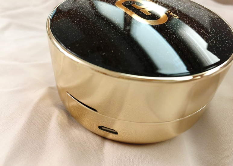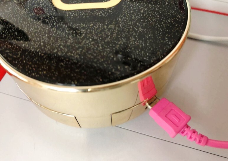 반짝반짝 골드 테두리로 되어 있고 위에는 우주를 담은 것처럼 반짝반짝 블랙 코팅으로 되어 있어요. 평소에는 집에서 사용할 때 마이크로 5핀을 사용합니다. 이렇게 마이크로 5핀을 넣으면 바로 파란색 불이 켜져요. 이 상태에서 저 버튼을 누르게 되면 뚜껑이 열리거든요.