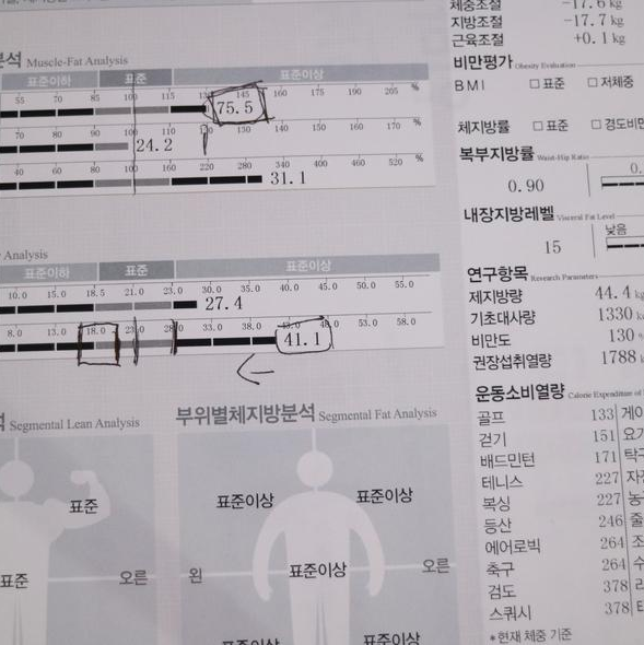 인바디 체크 위에 사진이 잘 안 보이시죠? 좀 확대해서 찍어봤어요. 몸무게 3킬로 감량된 거 진짜 놀랐어요 선생님이 음식 조절을 엄청 힘들게 시키지도 않았거든요 그런데도 3킬로나 감량이 되다니.. 너무 놀랐습니다!