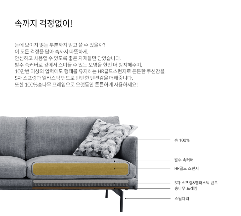 그리고, 두번째는 속커버가 또 안에 들어있어서 발수기능으로 얼룩이나 오염으로 부터 내장재를 보호할 수 있어서 안에 있는 것도 깨끗하게 유지할 수 있어요. 관리만 잘한다면 평생 깨끗한 새 제품 처럼 사용이 가능한 편한 가구랍니다.