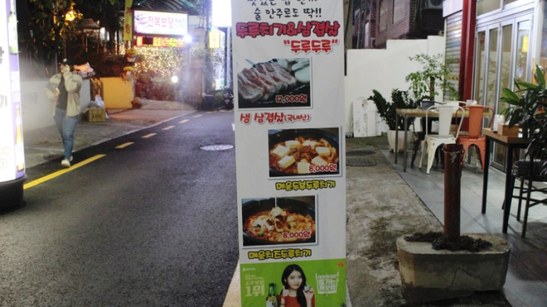 메뉴 벽에 있는 간판을 찍어봤어요. 주메뉴는 매운 치즈 두루치기랑 매운 두부 두루치기가 있는데, 저희는 치즈가 좋아서 매운 치즈 두루치기를 주문했답니다.