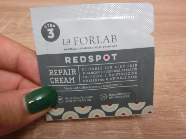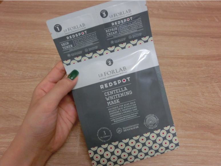 첫 번째는 레드 스폿 스킨토너, 그리고 두번째는 레드스팟 센텔라 화이트닝 마스크, 그리고 세번째 마지막으로 레드스팟 리페어 크림 순서대로 사용하는데 일반 마스크팩이랑 조금 다르죠? 이렇게 순서대로 3가지의 제품을 사용하면 효과가 더욱 뛰어난 것 같은데요 .