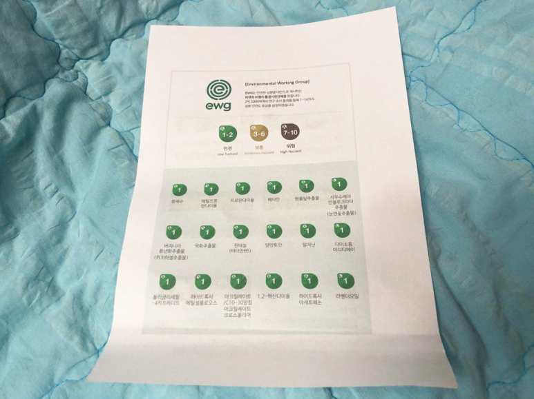 요즘 EWG라는 말을 많이 듣게 되거든요. 바로 안전한 성분을 대안으로 제시하는 미국 비영리 환경시민단체를 뜻하는데, 안전한 성분에 대한 꼼꼼한 기준이 있다고 해요. 따라서 이 마스크팩에 들어가는 성분들은 모두 1등급의 안전한 성분만 사용이 되었습니다.