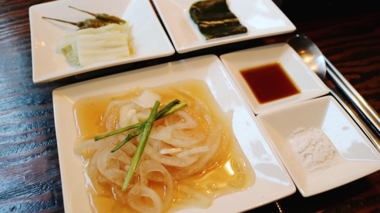 고기가 나오기 전에 밑반찬들이 나왔는데요. 양파절임, 소금, 소스, 백김치 등등 정말 정갈하게 나오더라고요. 진짜 소고기는 이것저것 함께 먹는 조합이 중요한데 조합이 잘 맛는 반찬들만 잘 모아서 주신 거 같더라고요.