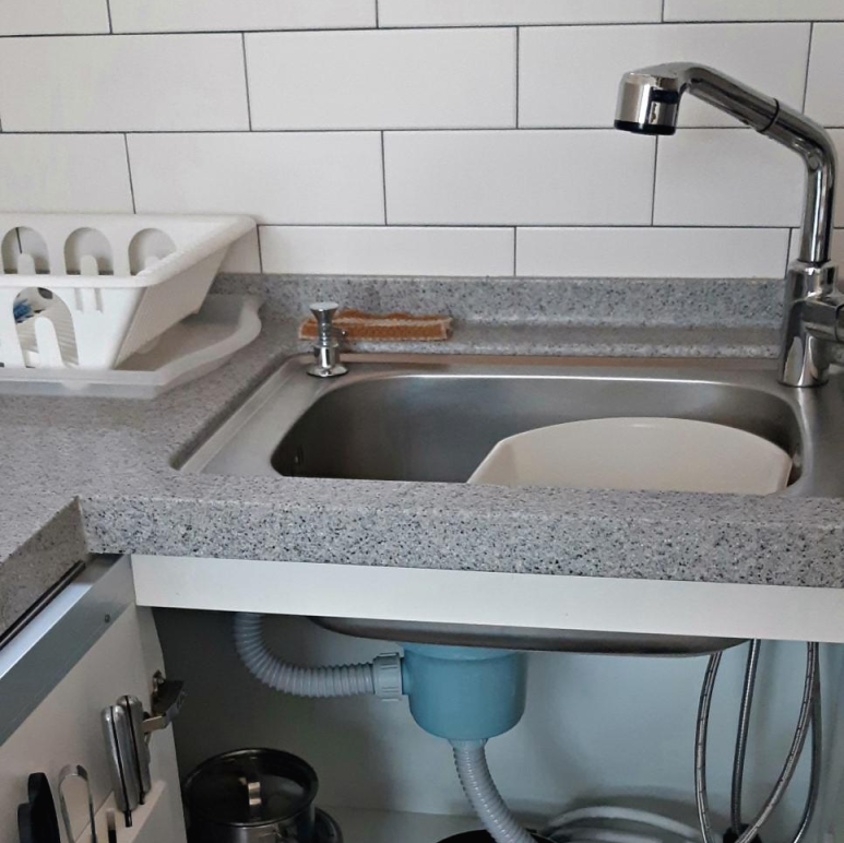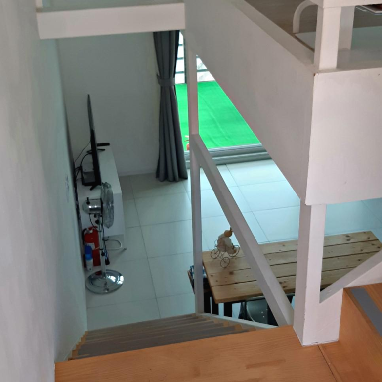 2층 올라가는 계단 옆에 주방이 있어요 앞에 테이블도 있고요!