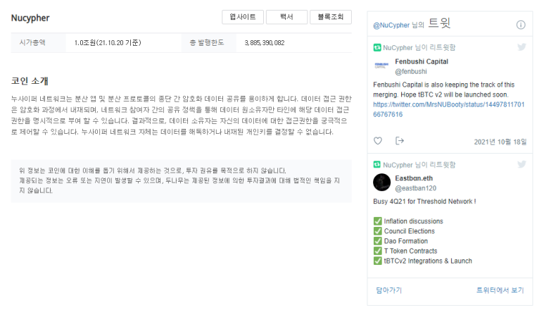 업비트에서 제공하는 누사이퍼 코인의 소개를 한번 보자.